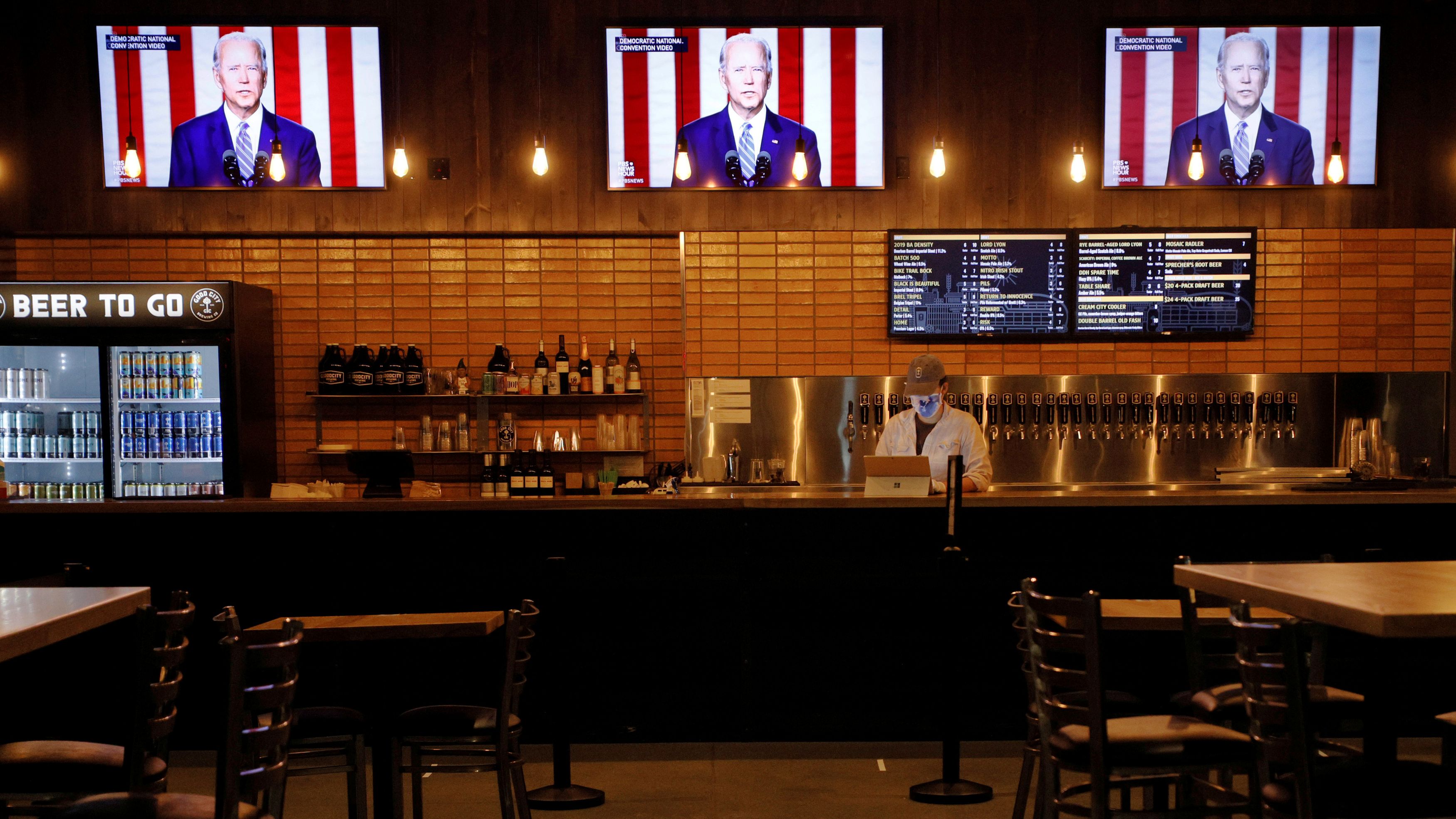 Televisions at Good City Brewing show footage of Democratic presidential nominee Joe Biden during the Democratic National Convention's broadcast, a largely virtual event due to COVID-19, in Milwaukee, Wisconsin, U.S., August 19, 2020. /Reuters