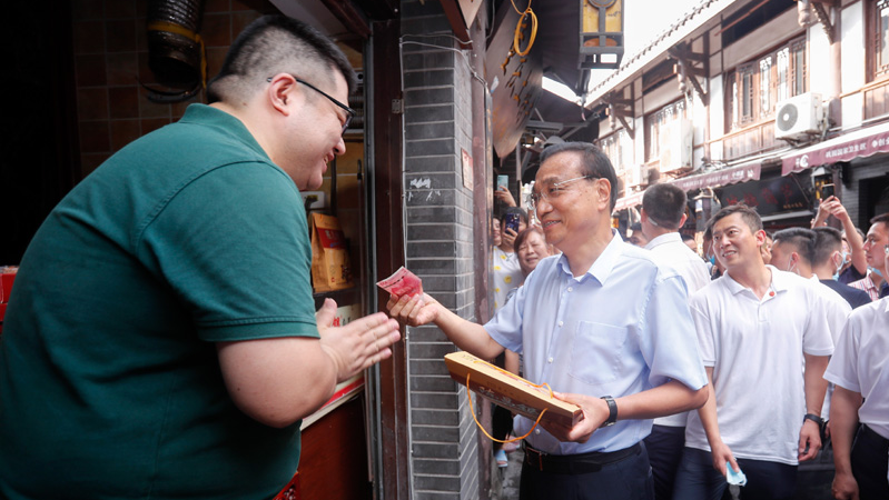 Chinese Premier Li Keqiang buys snacks at Ciqikou, a busy commercial center in flood-hit Chongqing Municipality, southwest China, August 20, 2020. /Gov.cn