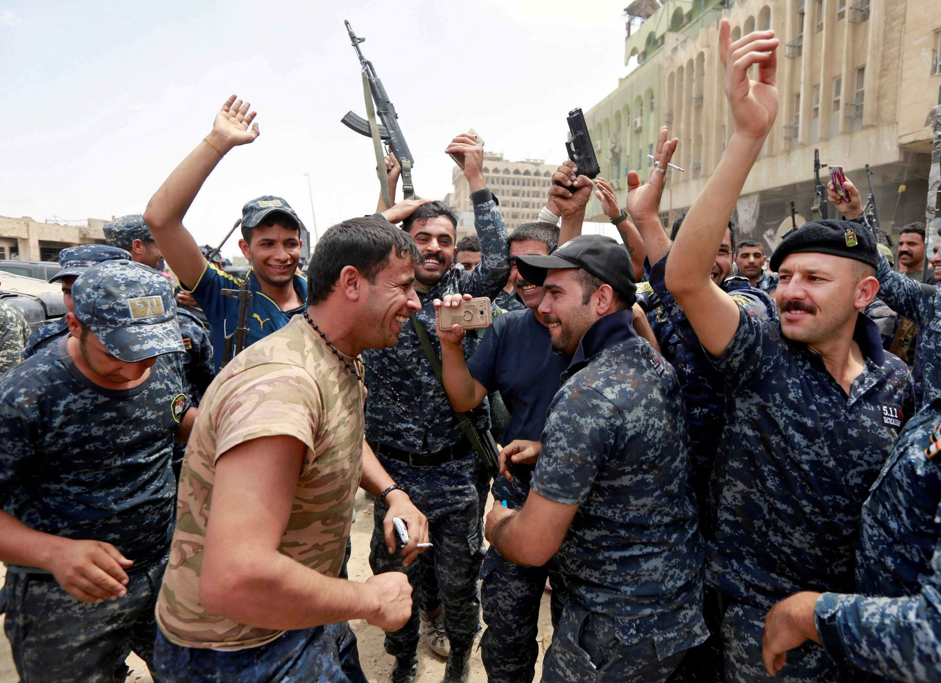 Iraqi federal police celebrate in Mosul after liberating the city from ISIL fighters on July 8, 2017. A new UN report says 2020 has seen a "significant increase" in ISIL attacks in Iraq and Syria compared to 2019. /Reuters