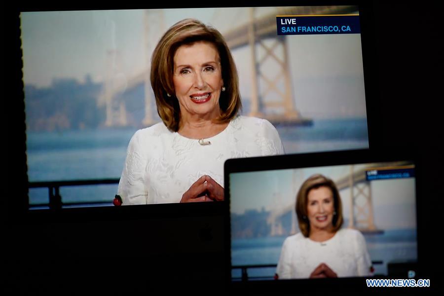 Images of U.S. House Speaker Nancy Pelosi speaking in a video feed of the 2020 Democratic National Convention are displayed on screens in Arlington, Virginia, U.S., August 19, 2020. /Xinhua
