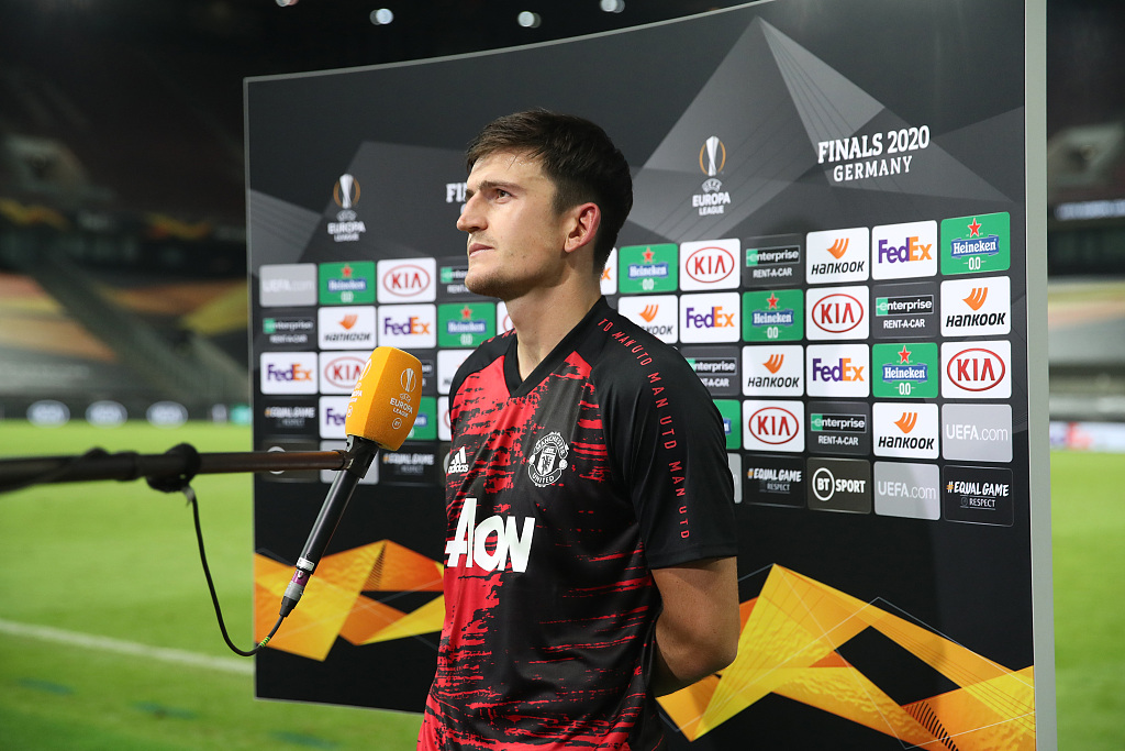 Harry Maguire of Manchester United speaks to the media following the UEFA Europa League semifinal against Sevilla in Cologne, Germany, August 16, 2020. /VCG
