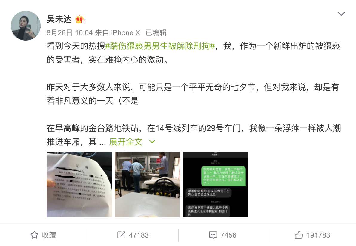 This post by @Wuweida, a Weibo female user, was forwarded over 47,000 times and has gained more than 190,000 likes in China's Twitter-like social media platform since August 26. She fell victim to a pervert's hands, on Beijing Subway line 14 during morning rush hour, but fortunately, undercover police helped her catch the man.