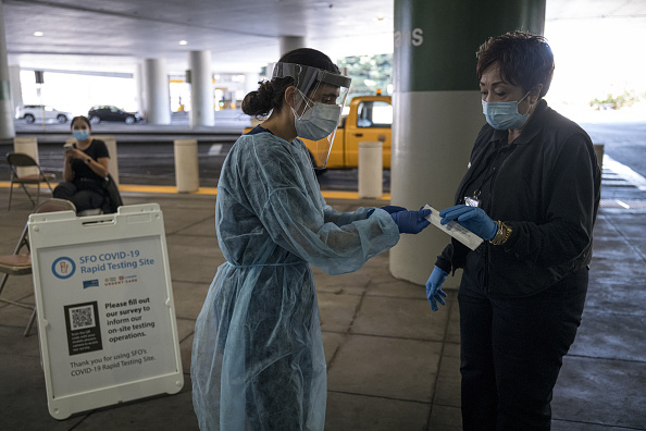 A medical worker wearing personal protective equipment, left, receives a nasal swab from an employee wearing a protective mask and glove prior to a rapid Covid-19 test at San Francisco International Airport (SFO) in San Francisco, California, on Thursday, Aug. 27, 2020. /Getty