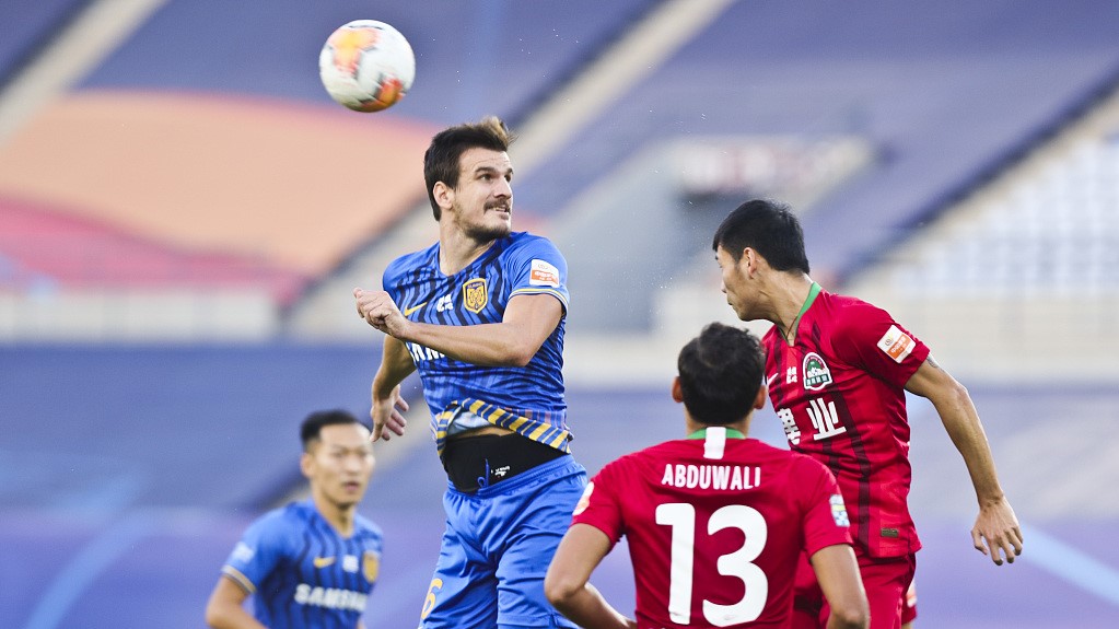 Ivan Santini of Jiangsu Suning (L2) and Wang Shangyuan (R1) of Henan Jianye compete for the ball in the CSL game in Dalian, August 30, 2020. /VCG