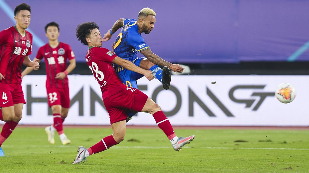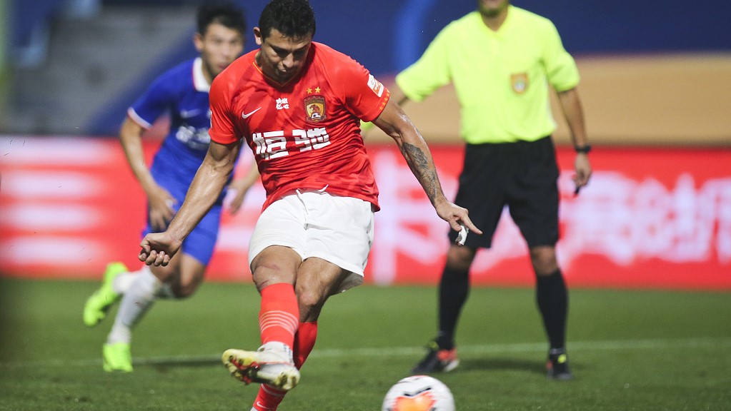 Ai Kesen of Guangzhou Evergrande shoots the ball in the CSL game against Shanghai Greenland Shenhua in Dalian, August 30, 2020. /VCG