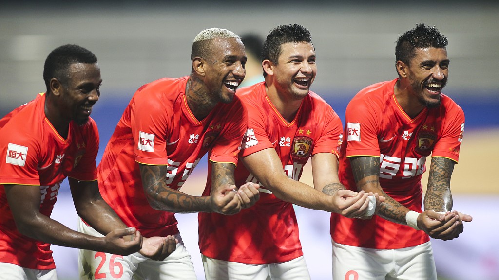 Players of Guangzhou Evergrande celebrate after scoring a goal in the CSL game against Shanghai Greenland Shenhua in Dalian, northeast China's Liaoning Province, August 30, 2020. /VCG