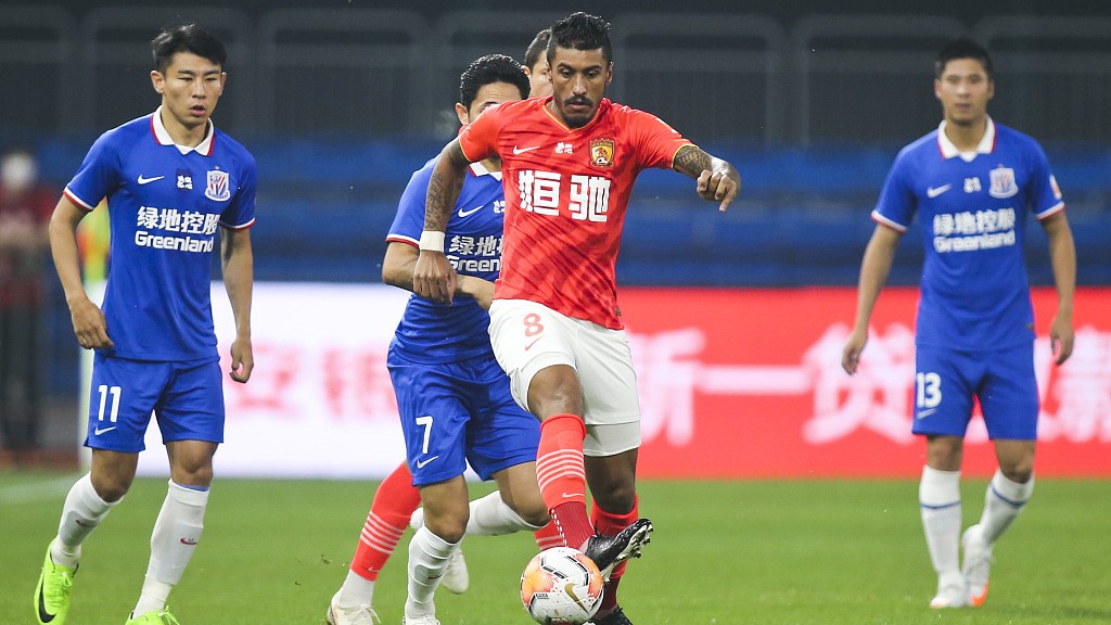 Paulinho (C) of Guangzhou Evergrande dribbles the ball in the CSL game against Shanghai Greenland Shenhua in Dalian, August 30, 2020. /VCG