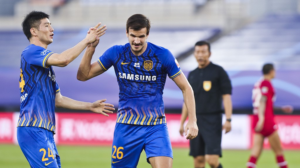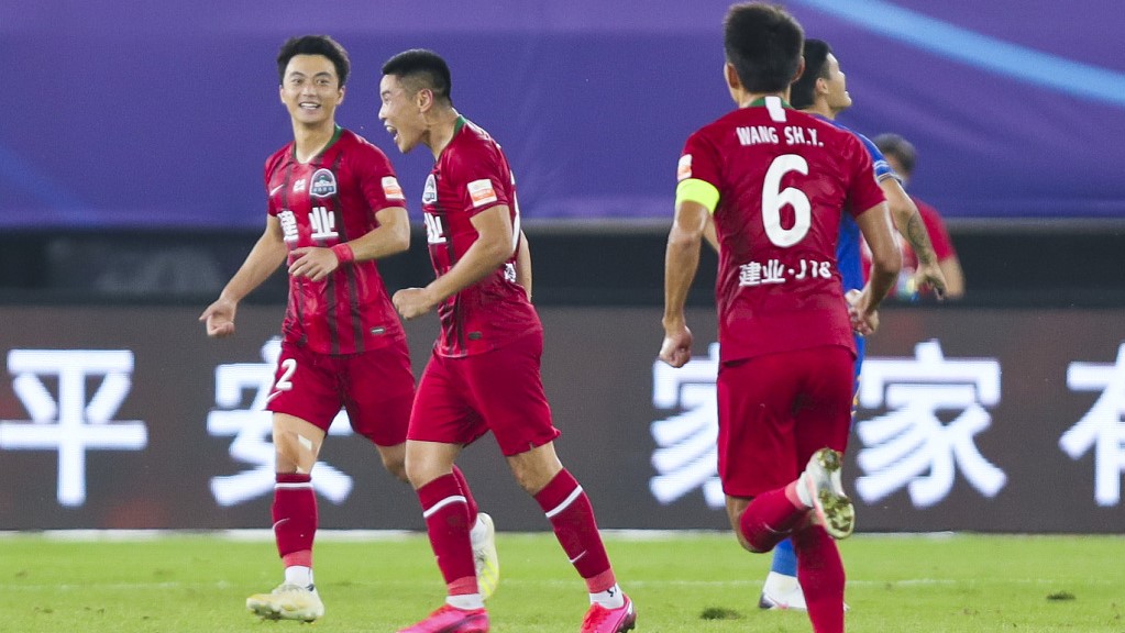 Players of Henan Jianye celebrate after scoring a goal in the CSL game against Jiangsu Suning in Dalian, August 30, 2020. /VCG