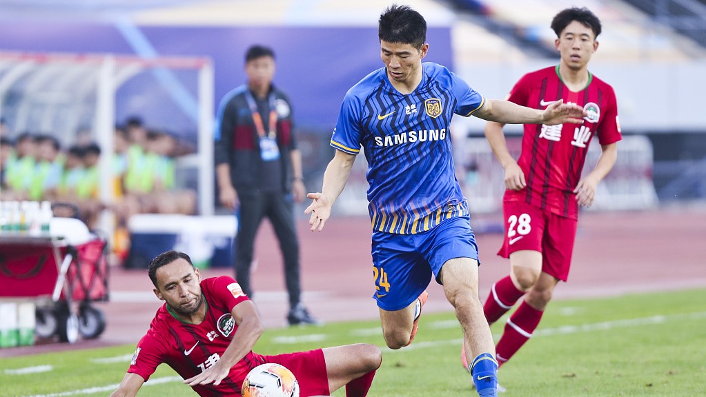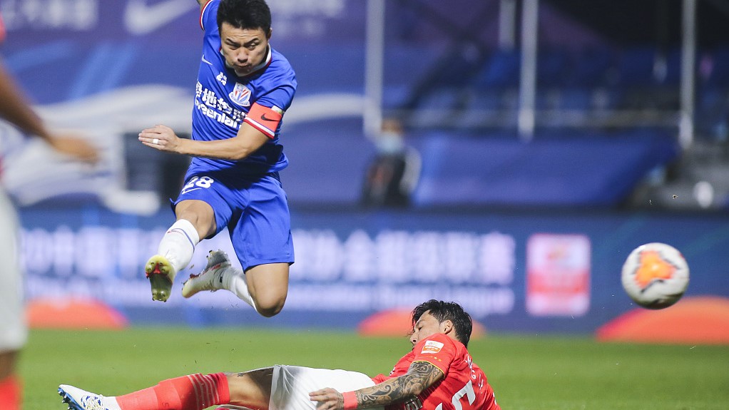 Cao Yunding of Shanghai Greenland Shenhua jumps to dodge a tackle in the CSL game against Guangzhou Evergrande in Dalian, August 30, 2020. /VCG
