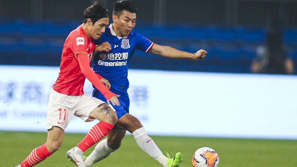Zhang Xiuwei #11 of Guangzhou Evergrande and Yu Hanchao of Shanghai Greenland Shenhua compete for the ball in the CSL game in Dalian, August 30, 2020. /VCG