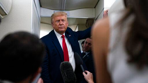 U.S. President Donald Trump talks to reporters aboard Air Force One after a campaign rally in Londonderry, New Hampshire, August 28, 2020. /AP