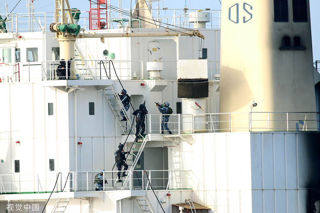 PLA Navy soldiers search for pirates after rescuing 19 sailors from the OS35 ship, April 9, 2017. /VCG