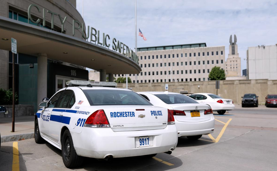 A view of police cars parked outside City Public Safety Building following the death of a Black man, Daniel Prude, after police put a spit hood over his head during an arrest on March 23, in Rochester, New York, U.S., September 3, 2020. /Reuters