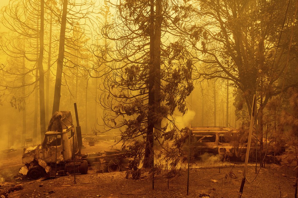 Scorched vehicles rest in a clearing following the Bear Fire in Butte County, California, September 9, 2020. /AP