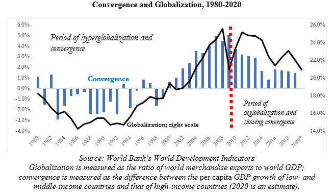 Since the two phenomena were connected, the recent return of deglobalization has substantially moderated the convergence: low- and middle-income countries that were growing at about three-four percent per capita annually before the global financial crisis have been averaging one-two percent growth thereafter.