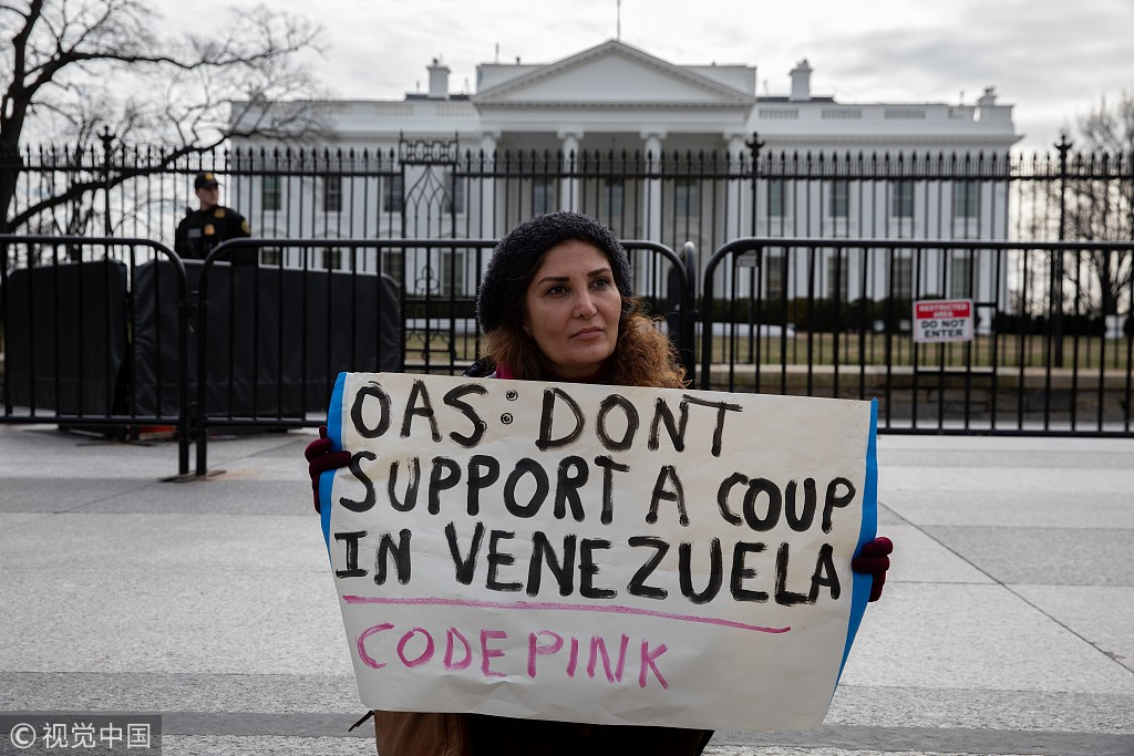 A woman holds a placard in support of Venezuela's President Nicolas Maduro in front of White House in Washington, January 26, 2019. /VCG Photo