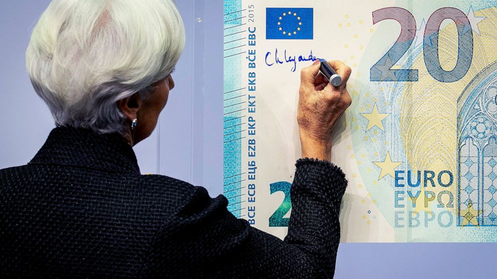 The President of the European Central Bank Christine Lagarde writes her signature on an oversize euro banknote at the ECB in Frankfurt, Germany, November 27, 2019. /AP