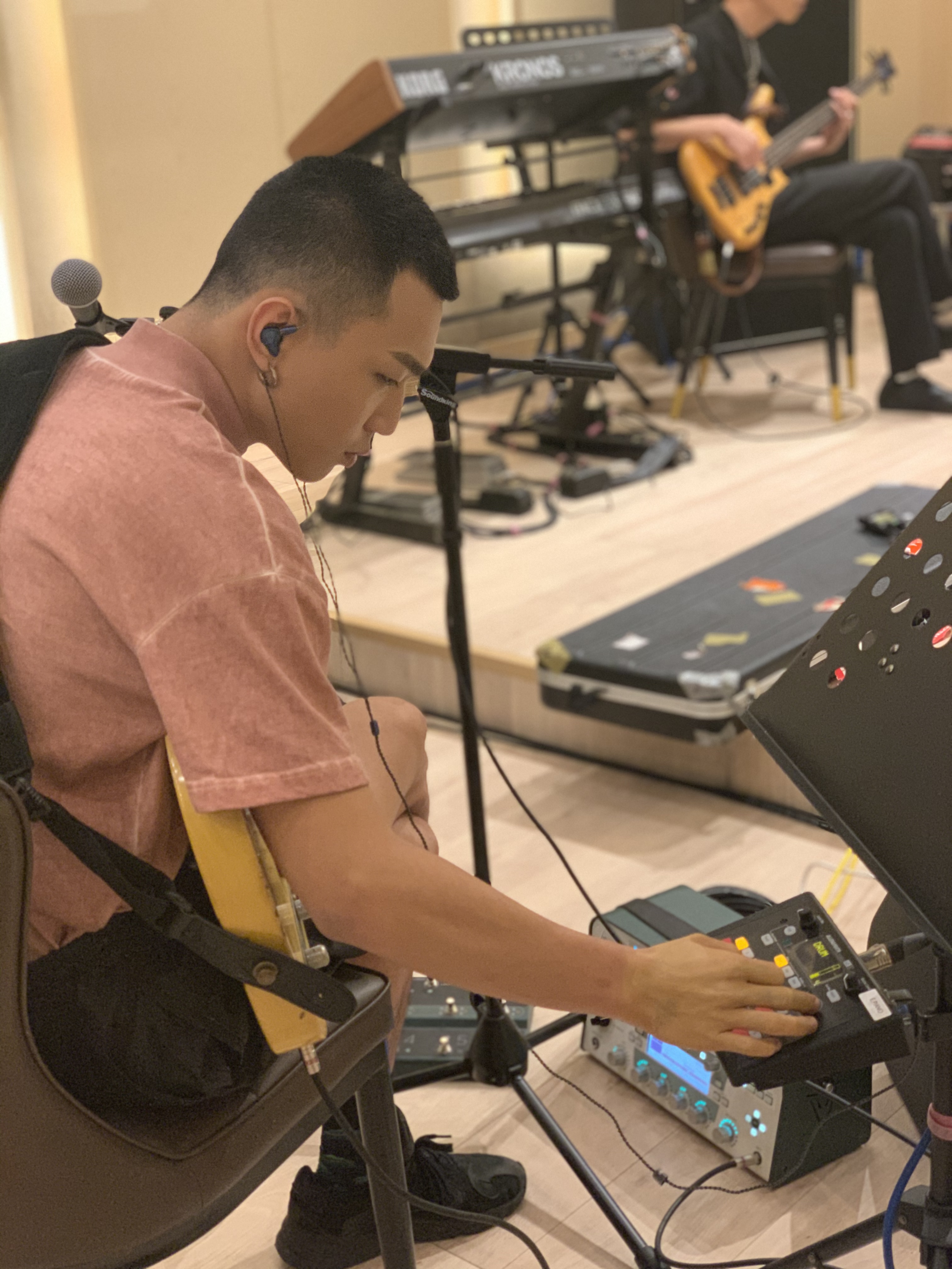 Lead vocalist Eric Tsai tests equipment. /CGTN