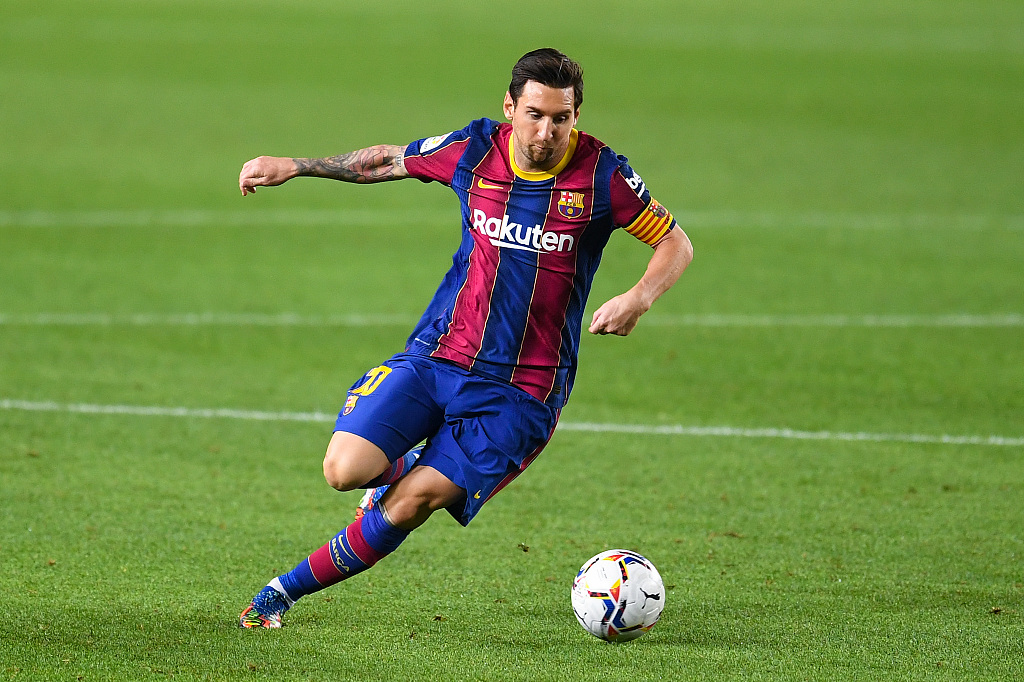 Barcelona's Lionel Messi dribbles the ball during a La Liga clash with Villarreal CF at Camp Nou, Barcelona, Spain, September 27, 2020. /VCG