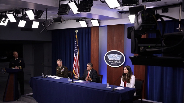 Director of the Pentagon's Joint Artificial Intelligence Center Nand Mulchandani (C), Chief of Joint Warfighting Operations of JAIC Army Colonel Brad Boyd (L), and Chief of Testing and Evaluation of JAIC Jane Pinelis (R) participate in a news conference at the briefing room of the Pentagon on September 10, 2020 in Arlington, Virginia. /Getty