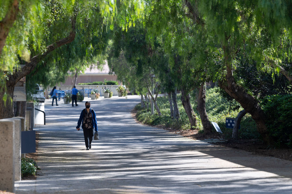 A woman walks through a mostly empty campus at the University of California, Irvine in Irvine, CA, October 2, 2020. /Gettyimages