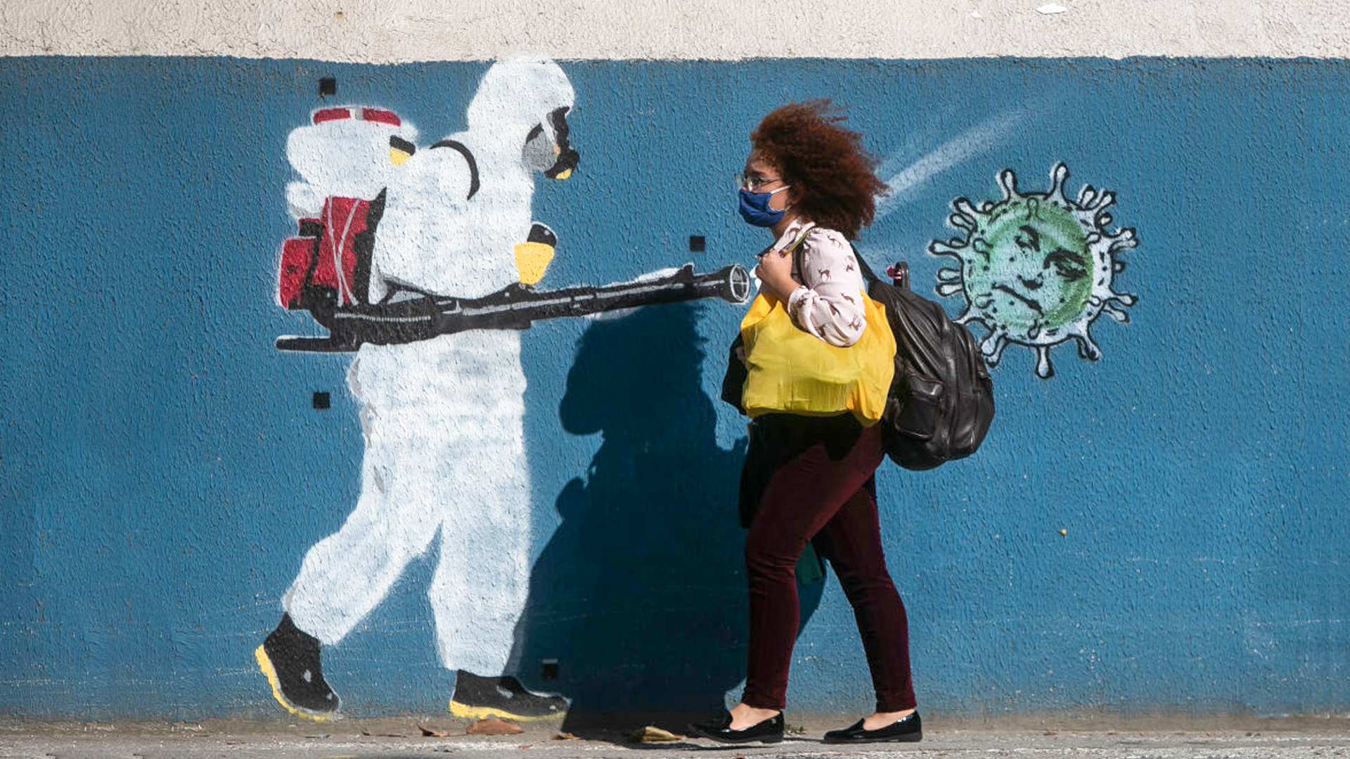 A woman wearing a mask walks past a wall with a graffiti in Rio de Janeiro, Brazil, June 8, 2020. /Gettyimages