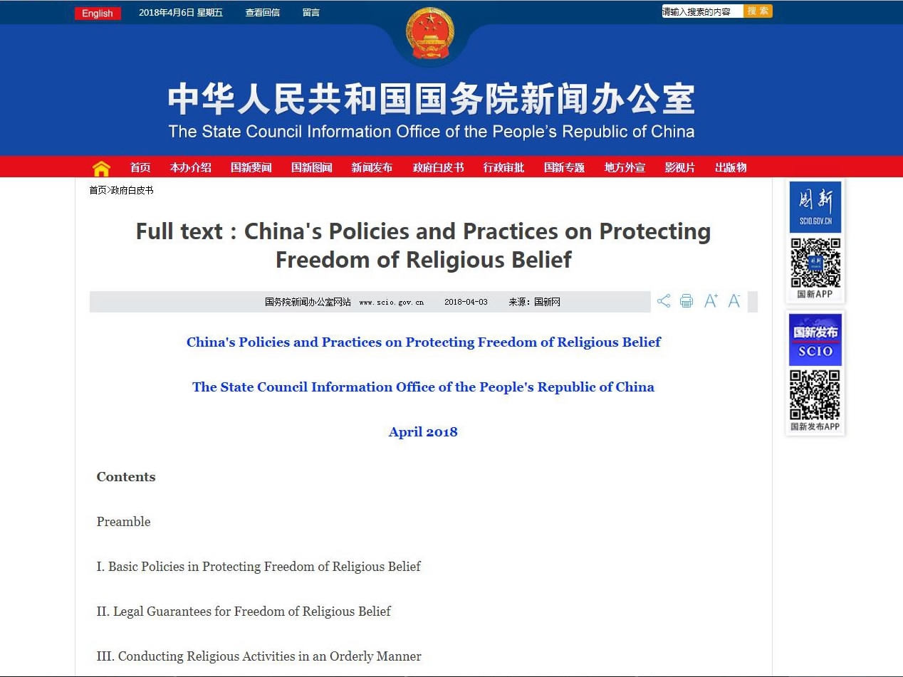A screenshot of the official webpage of China's State Council Information Office displaying the White Paper titled "China's Policies and Practices on Protecting Freedom of Religious Belief."
