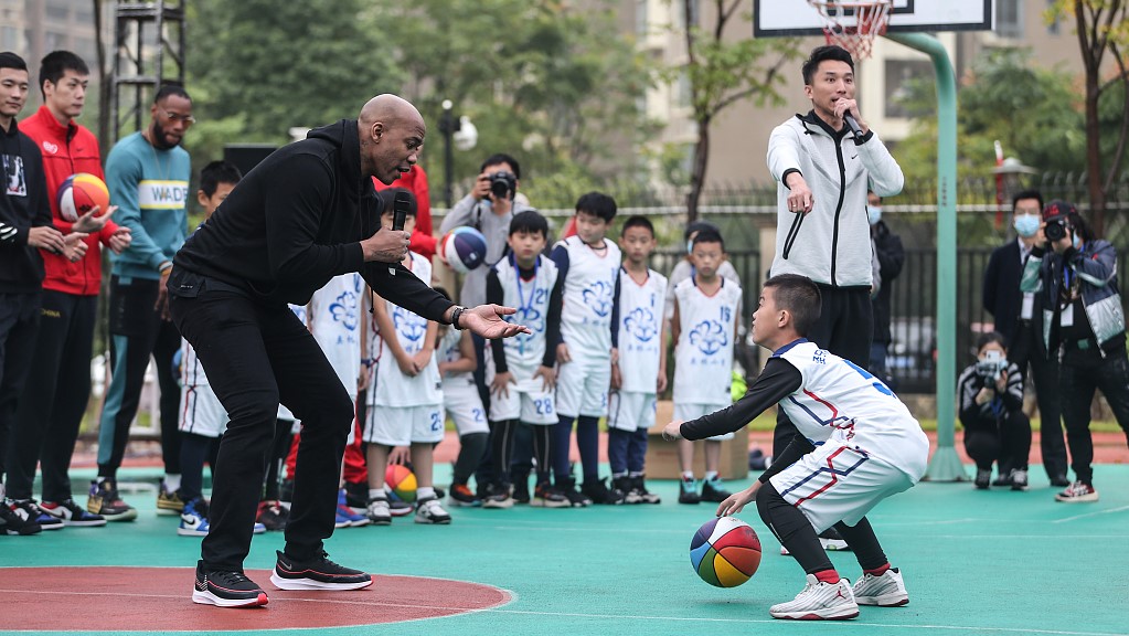 Yao Ming (top C), president of the Chinese Basketball Association, takes a photo with CBA stars and primary school students, Wuhan, Hubei Province, central China, October 4, 2020. /VCG