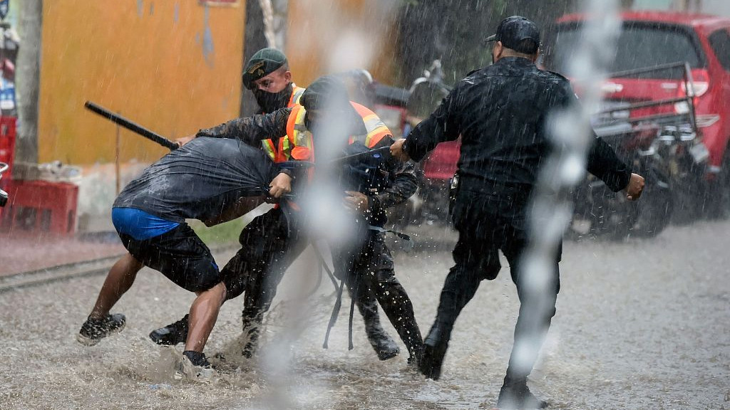 Undocumented migrants from Honduras clashes with Guatemala police, October 3, 2020. /VCG