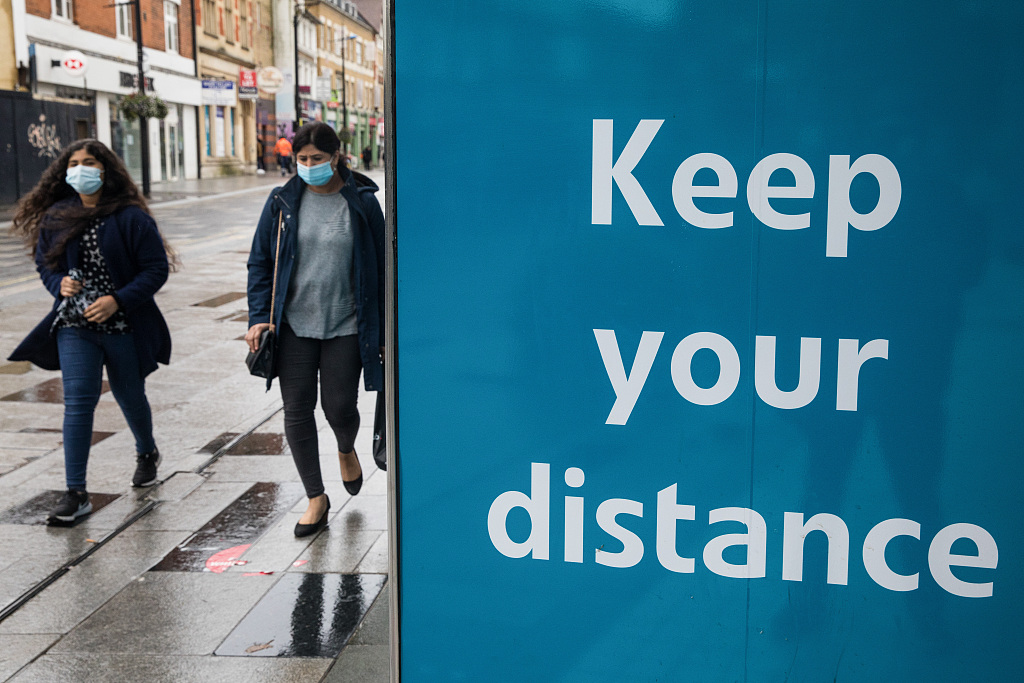 People on a UK street pass by a "Keep your distance" message. /VCG