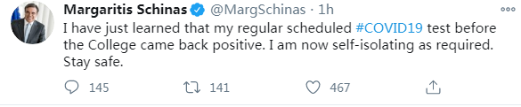 "I have just learned that my regular scheduled COVID19 test ... came back positive. I am now self-isolating as required," Schinas said in a Twitter post on Tuesday.