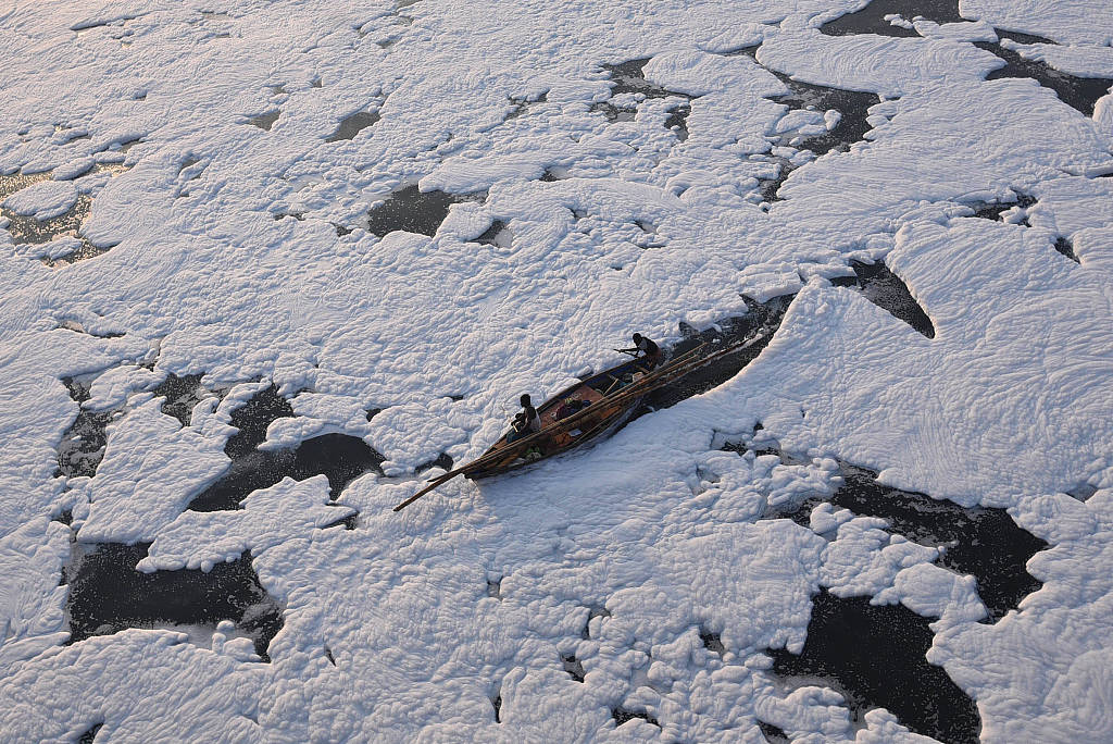 Fishermen seen at work in heavily polluted waters of the Yamuna River, at Kalindi Kunj, New Delhi, India, October 8, 2020. /CFP