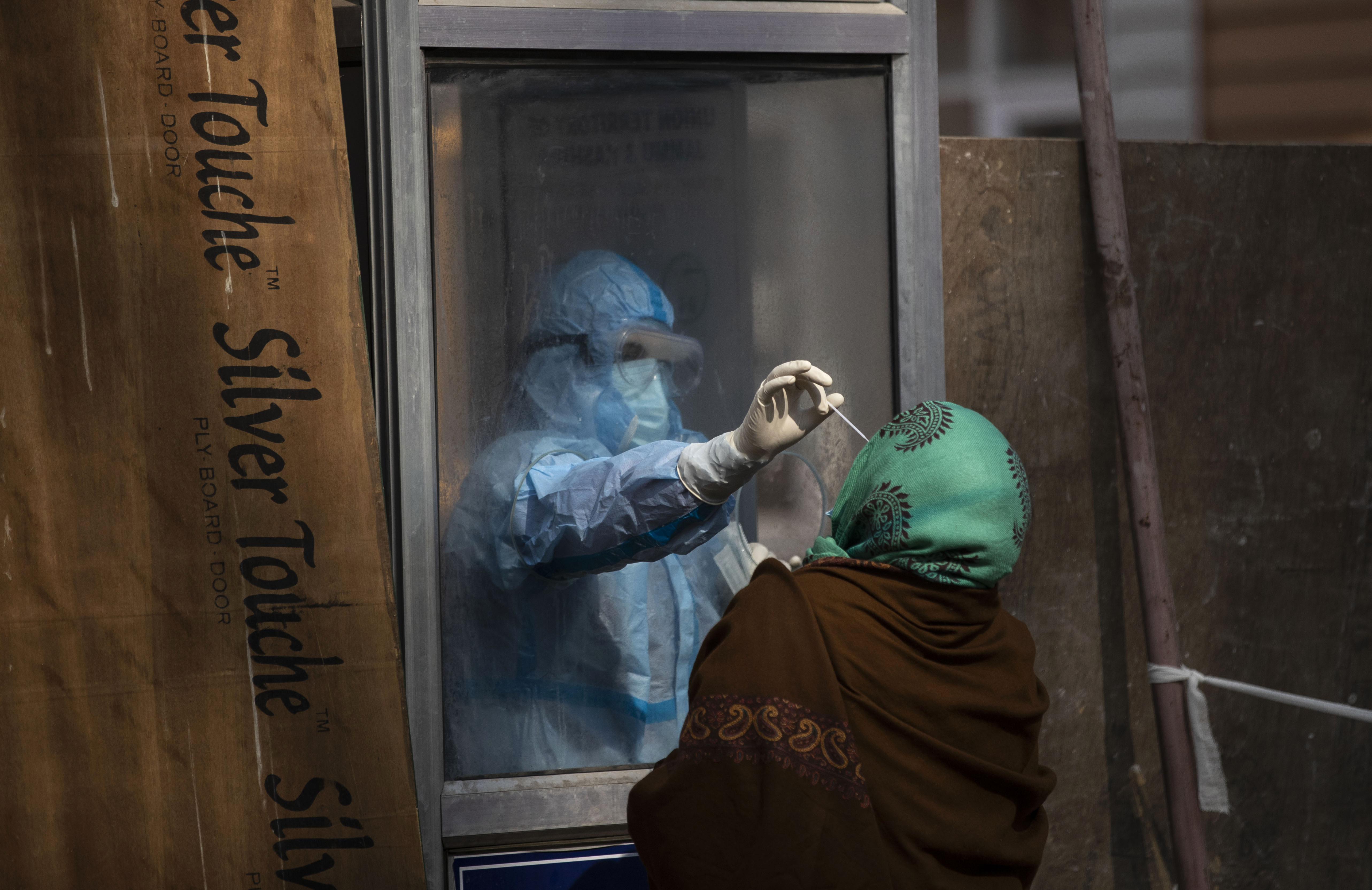 A Kashmiri health worker takes a nasal swab sample to test for COVID-19 in Srinagar, Indian-controlled Kashmir, November 4, 2020. /AP
