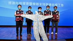 Xia Xiaodan (L), a nurse at the First People's Hospital of Huainan City, east China's Anhui Province, who volunteered to aid Hubei in fighting the COVID-19 epidemic, receives Mongolia-donated mutton on December 2, 2020. /VCG