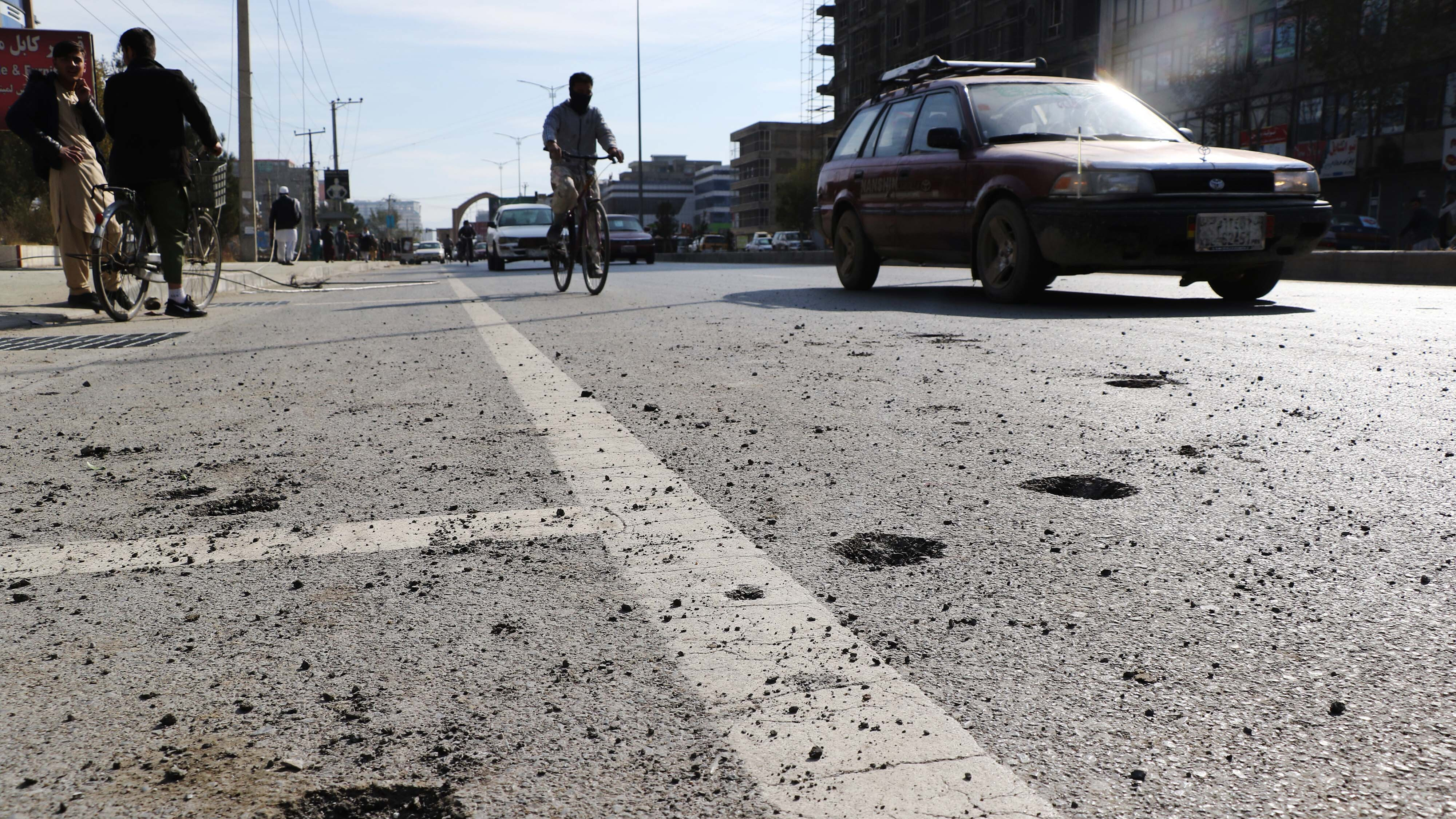 Afghan security officials inspect the scene of magnetic bomb blasts and rocket attacks in Kabul, Afghanistan, November 21, 2020. /Getty Images