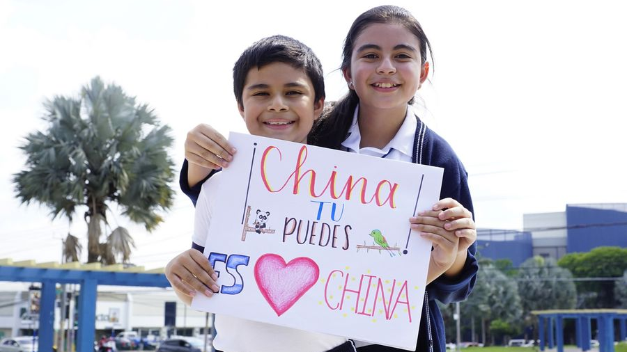 Valeria Castellano, 13, with her 11-year-old brother Javier Castellano, shows a painting with words of encouragement to China in San Salvador, El Salvador, February 7, 2020. /Xinhua