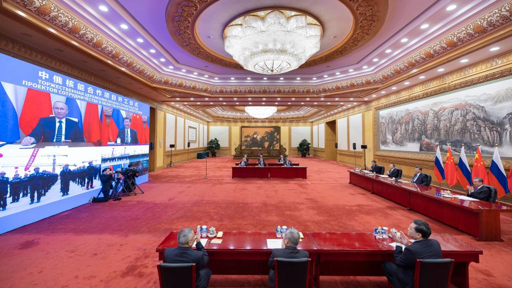 Chinese President Xi Jinping and his Russian counterpart Vladimir Putin witness the ground-breaking ceremony of a bilateral nuclear energy cooperation project, Tianwan Nuclear Power Plant and Xudapu Nuclear Power Plant, via video link in Beijing, capital of China, May 19, 2021. /Xinhua