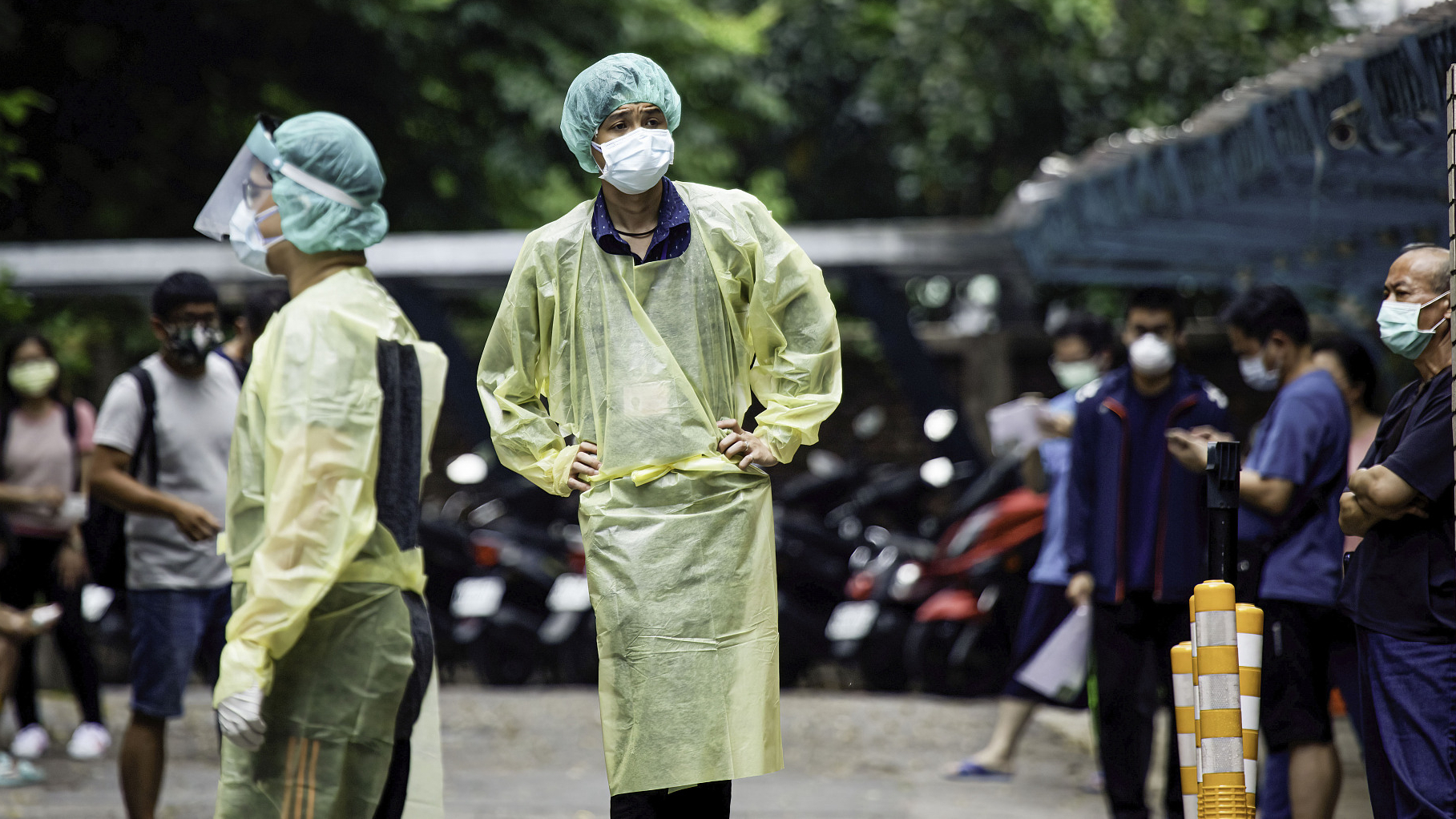 Medical staffers wearing Personal Protective Equipment suite are at a rapid COVID-19 test station in New Taipei City, May 24, 2021. /CFP