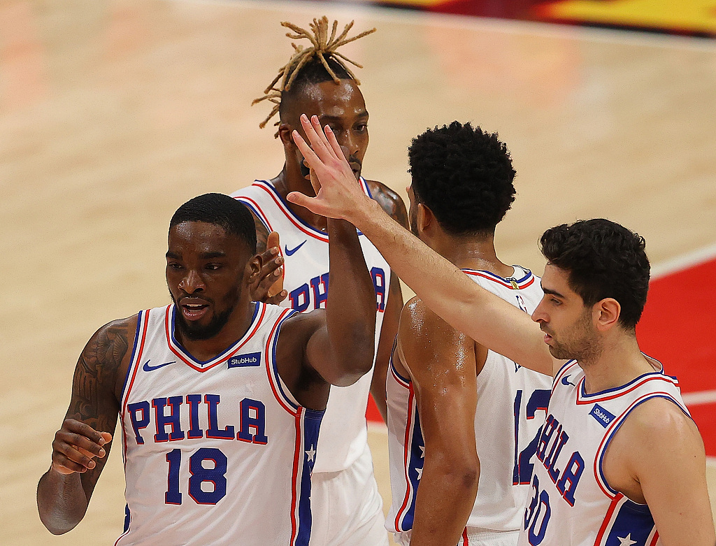 Players of the Philadelphia 76ers celebrate in Game 3 of the NBA Eastern Conference semifinals against the Atlanta Hawks at State Farm Arena, June 11, 2021. /CFP