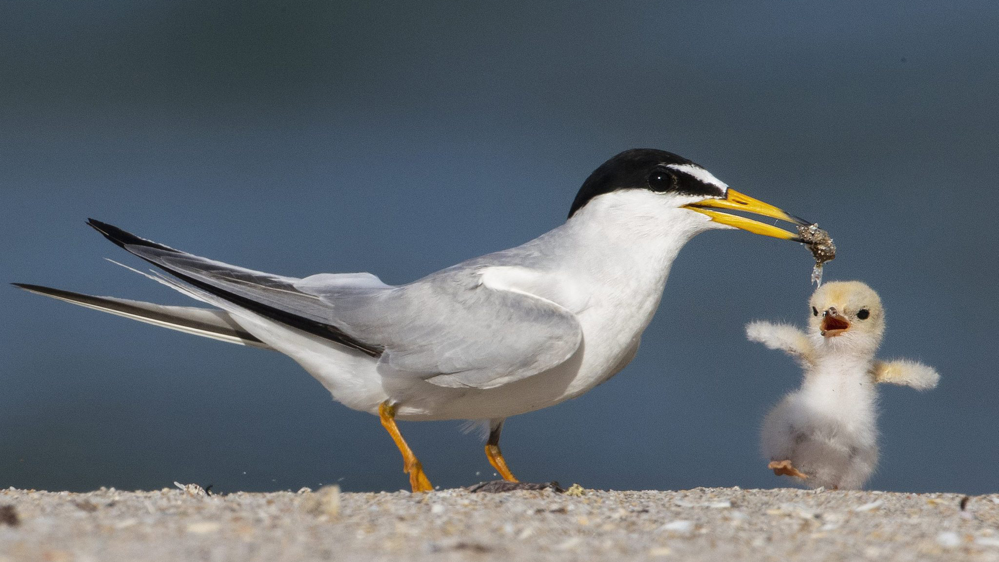 A tern chick jumps for joy as its parents return with food. These adorable baby least terns just couldn't contain their excitement at realizing their freshly-caught fish supper was on its way.