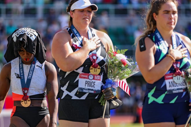 Gwendolyn Berry (left) turns away from U.S. flag during the U.S. National Anthem as DeAnna Price (center) and Brooke Andersen also stand on the podium after the Women's Hammer Throw final, June 26, 2021. /Getty