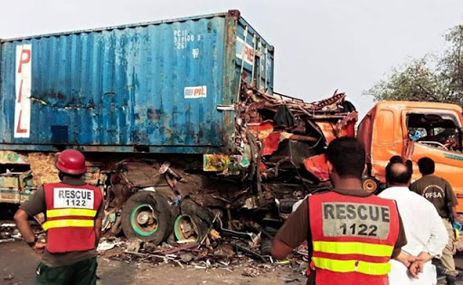 Rescue officials said the accident occurred when a bus collided with a container truck at about 5.40 a.m. in Dera Ghazi Khan district, 466 kilometers southeast of Lahore.