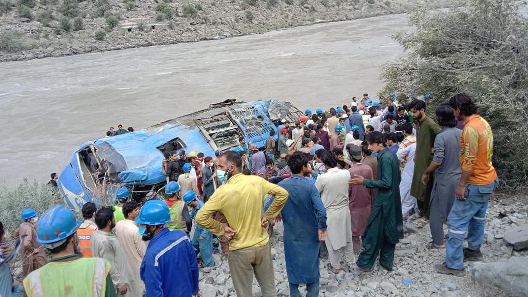 Pakistani people at the site where a bus fell into a ravine following a bomb attack, in Kohistan district, Pakistan, July 14, 2021. /CFP