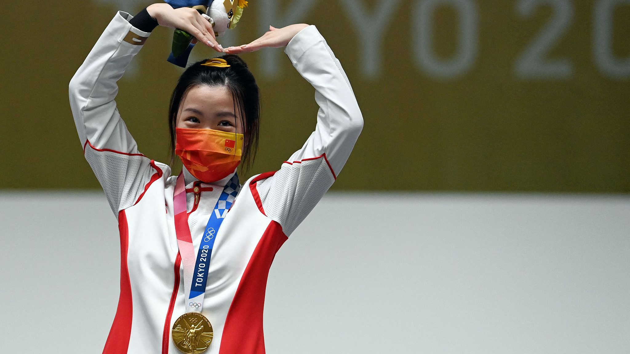 Yang Qian of China celebrates after winning the first gold medal at the Tokyo Olympics in the women's 10-meter air rifle final in Tokyo, Japan, July 24, 2021. /CFP