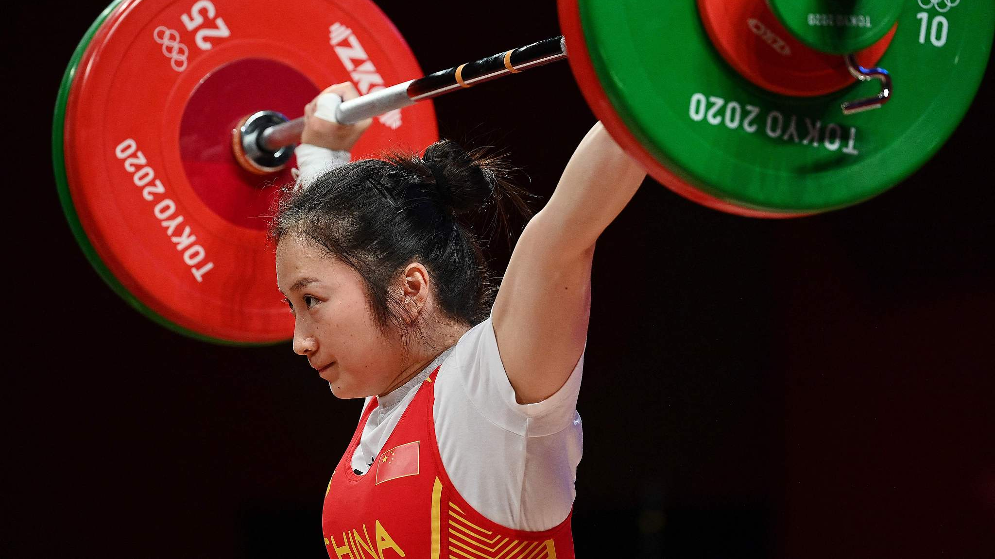 Liao Qiuyun of Team China in action during the women's 55kg weightlifting finals at the Tokyo Olympics in Tokyo, Japan, July 26, 2021. /CFP