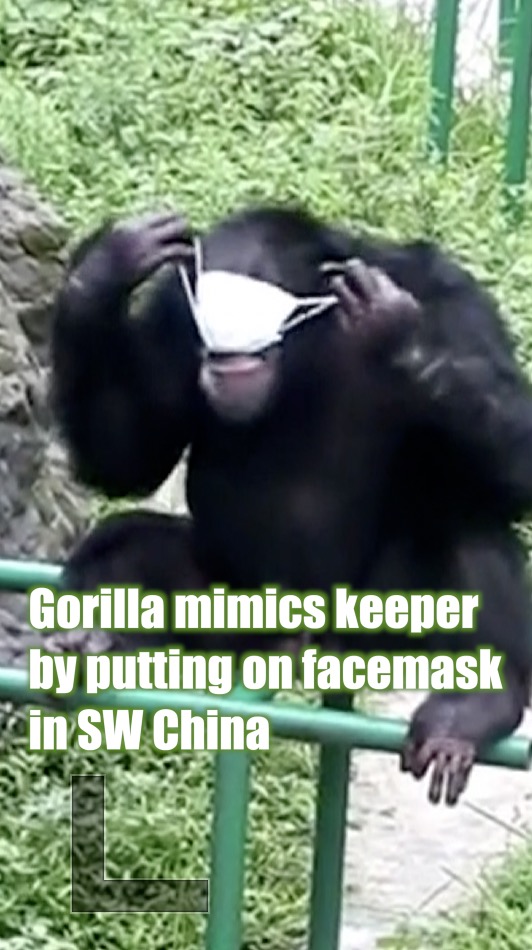 A gorilla mimicked its keeper by washing hands and attempting to put on a facemask in southwest China's Chongqing Municipality.