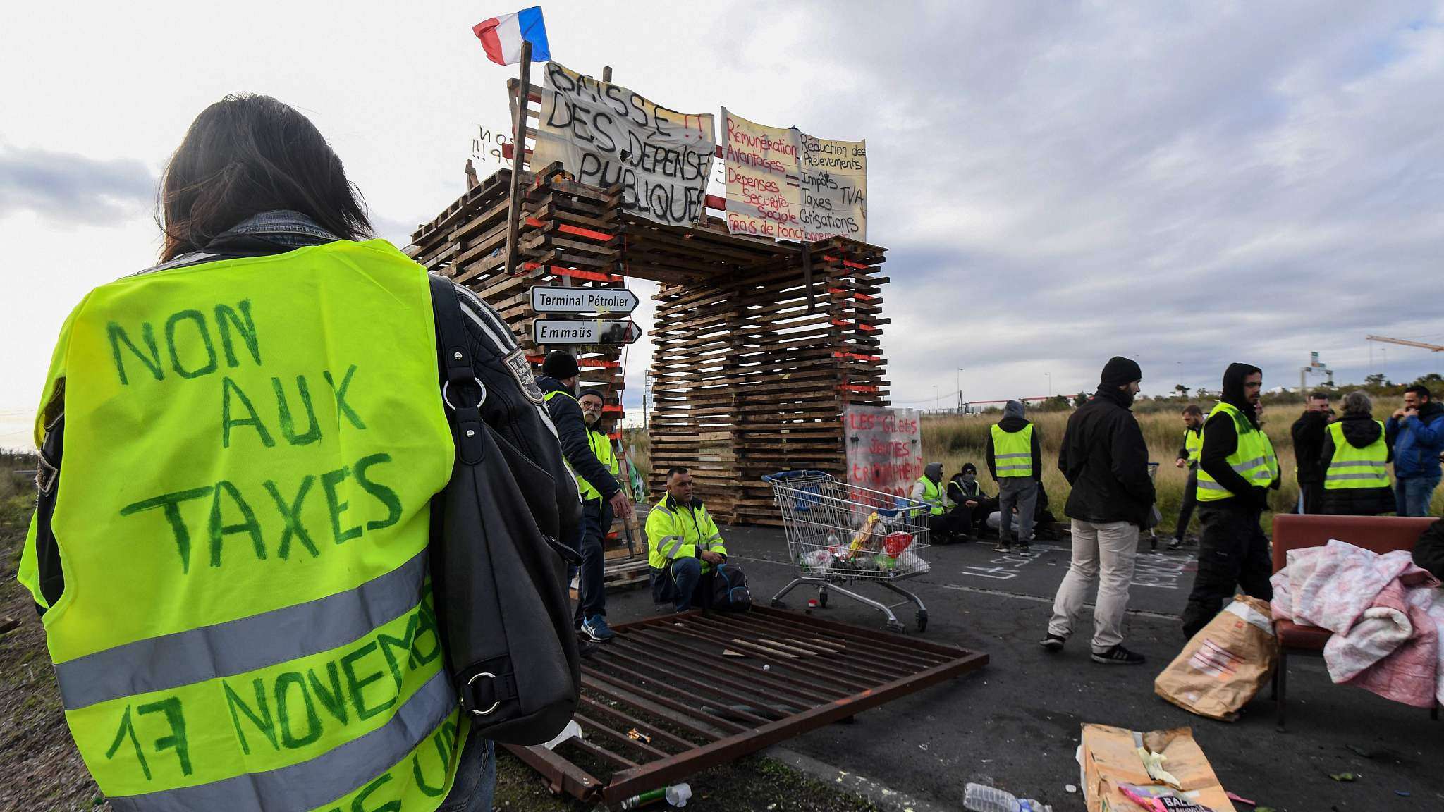 "Yellow vest" protesters block the road leading to the Frontignan oil depot in southern France, as they demonstrate against the rise in fuel prices and the cost of living, December 3, 2018. /VCG