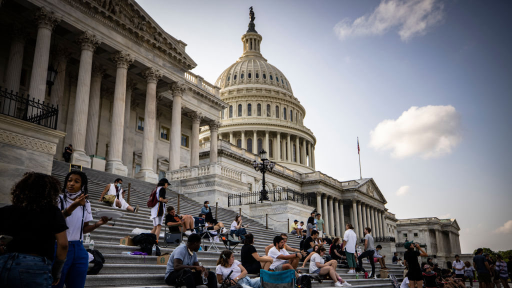 Activists occupy the steps to the House of Representatives with U.S. Rep. Cori Bush at the U.S. Capitol Building in Washington, D.C., August 1, 2021. /Getty