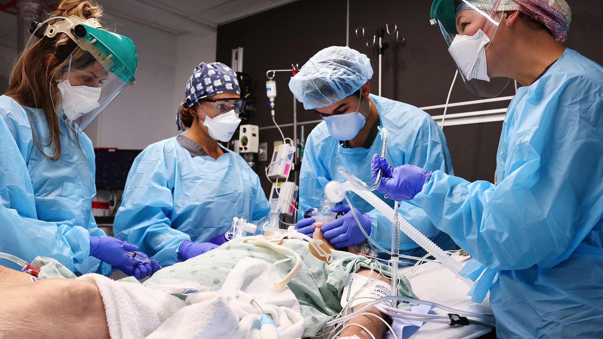 Clinicians intubate a COVID-19 patient in an ICU at Lake Charles Memorial Hospital in Lake Charles, Louisiana, U.S., August 10, 2021. /CFP