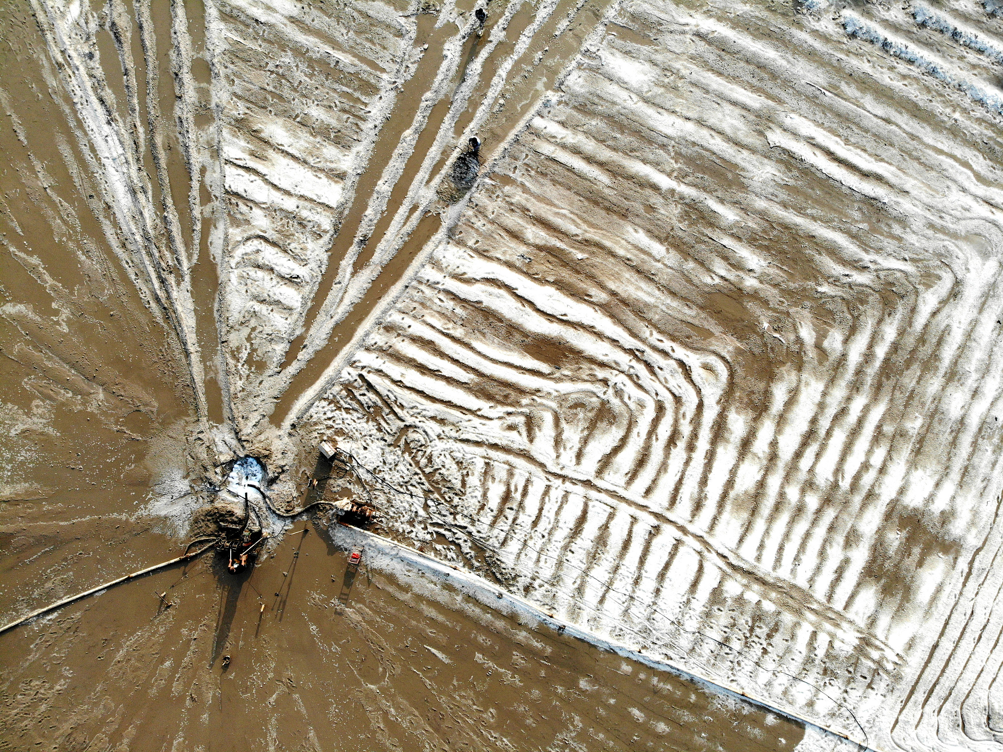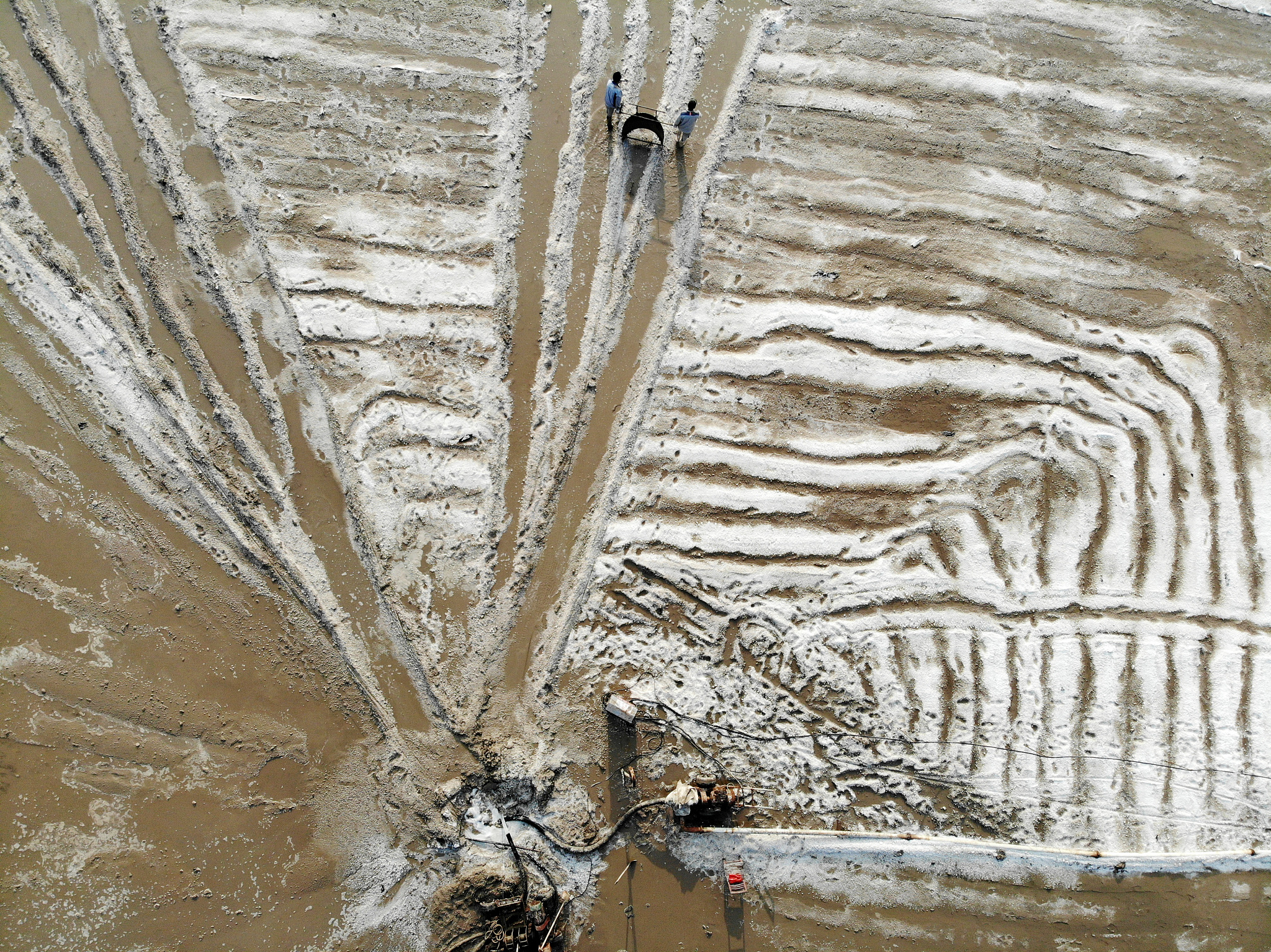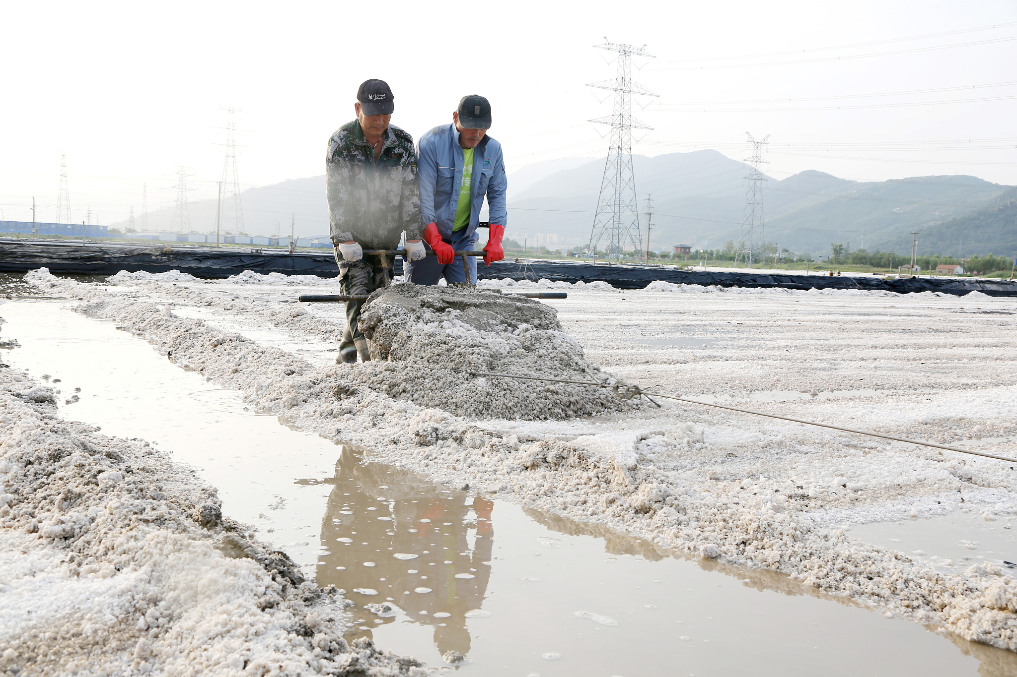 About 10,000 hectares of salt fields in Lianyungang City, east China's Jiangsu Province, began to enter the autumn salt harvesting period. Workers are taking advantage of the fine weather to step up autumn salt harvesting and stacking operations.